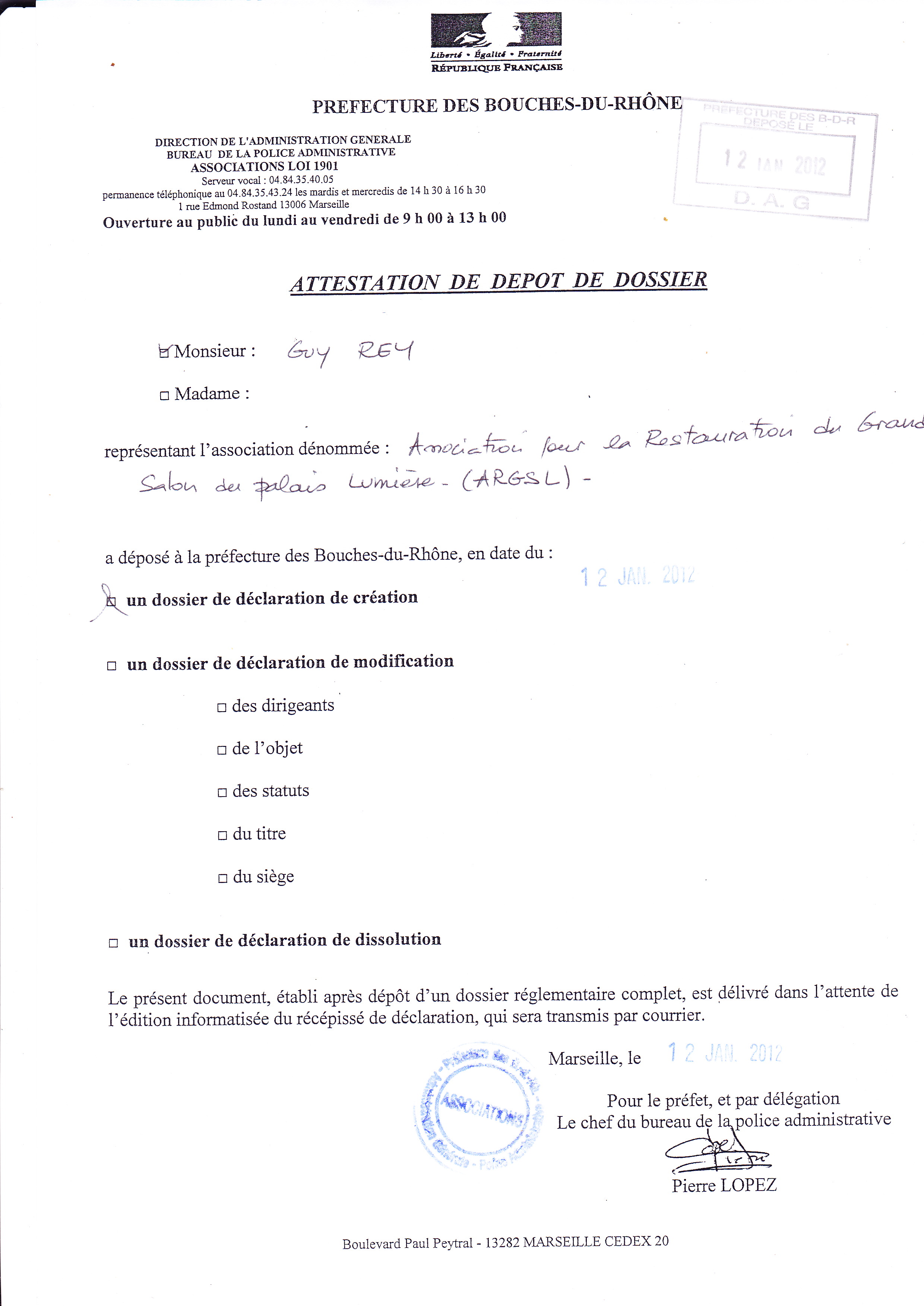 Notre assemblée s’est constituée le 7 janvier 2012 (Compte rendu & les statuts). Le dossier déposé en préfecture le 12 janvier (Attestation), est paru au Journal Officiel des associations du 03/03/2012 sous le n° 158.